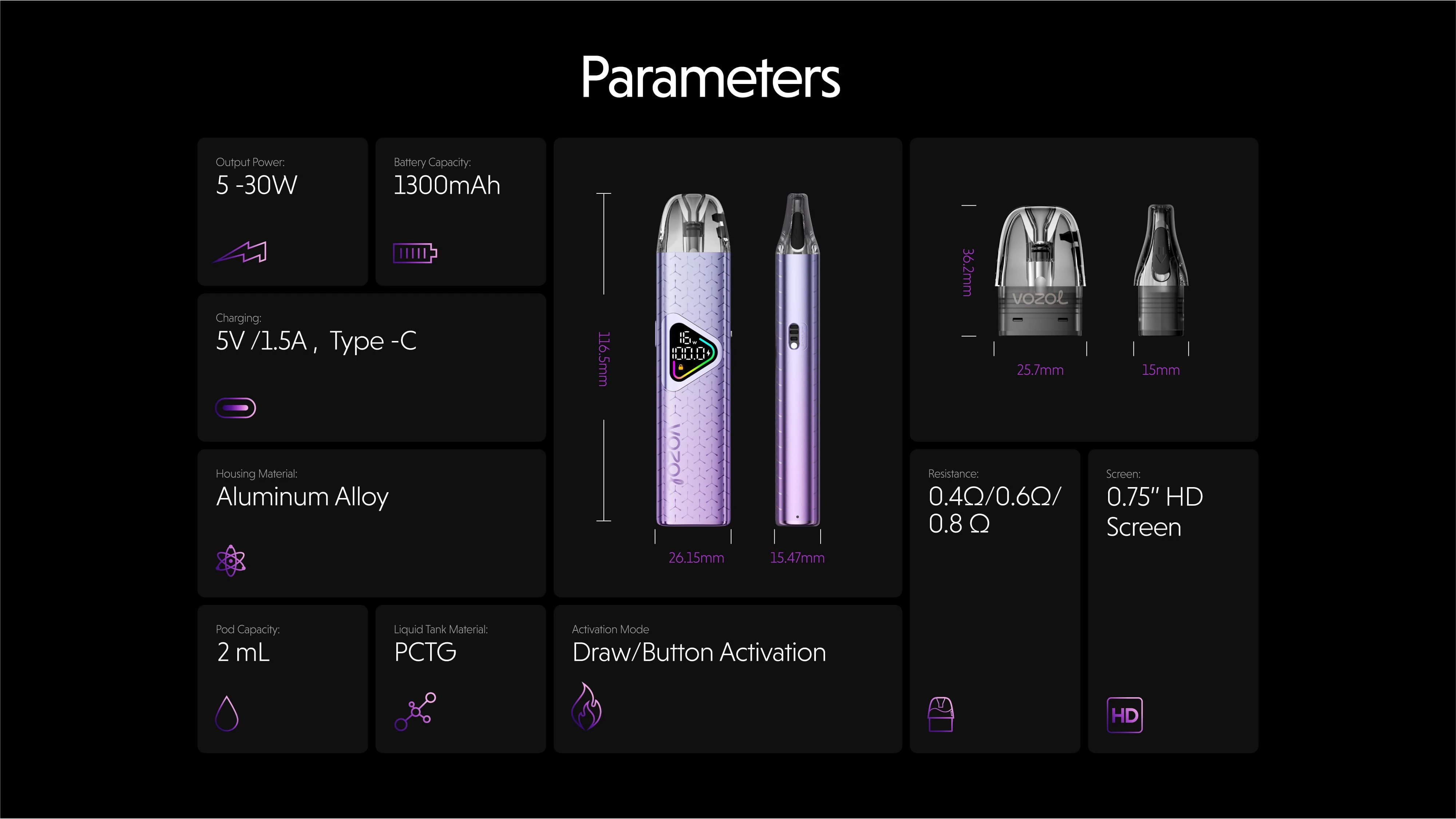 Une autonomie qui suit votre rythme Ne tombez plus jamais en panne. Sa batterie haute densité de 1300 mAh surpasse la concurrence directe. Grâce à la charge ultra-rapide USB-C 1.5A, récupérez 80% de batterie en seulement 30 minutes. C’est l’assurance d’une vape sereine tout au long de la journée.
