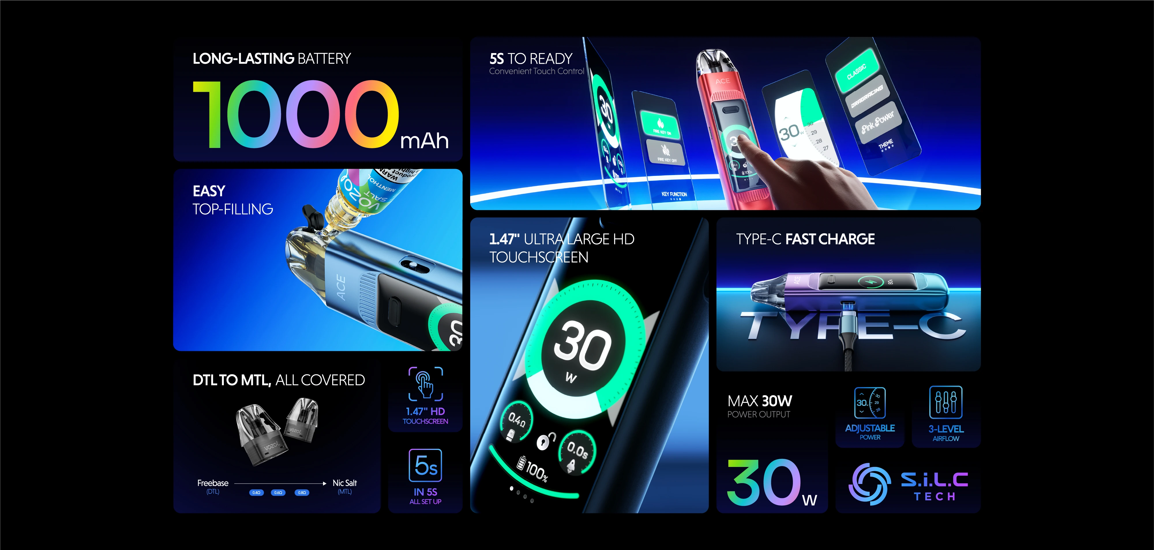 Sous son allure compacte, le Ace Max cache une batterie intégrée de 1000 mAh, capable de soutenir des sessions prolongées tout au long de la journée sans recharge fréquente. Vous pouvez ajuster la puissance de 5 W à 30 W, ce qui vous permet de passer facilement d’une vape douce à une vapeur plus dense et intense selon vos préférences.